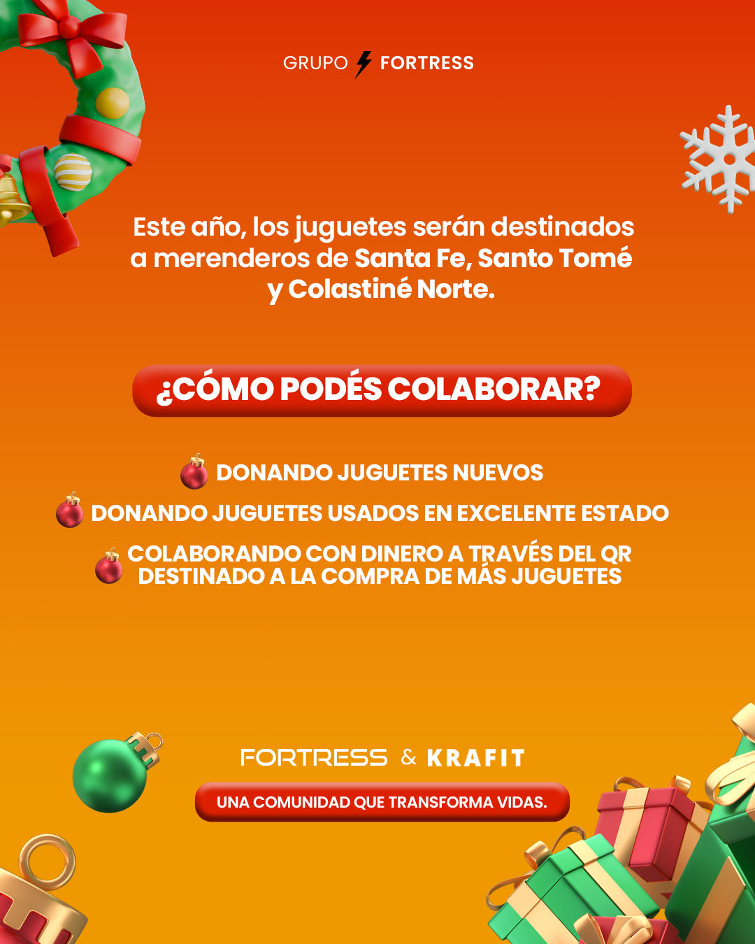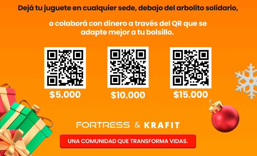 Las donaciones se reciben en todas las sedes Fortress y Krafit. Podés dejarlas bajo el árbolito solidario que preparamos o escanear el QR y colaborar desde tu teléfono. Es un gesto simple, pero con un alcance enorme.